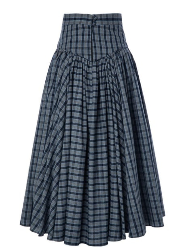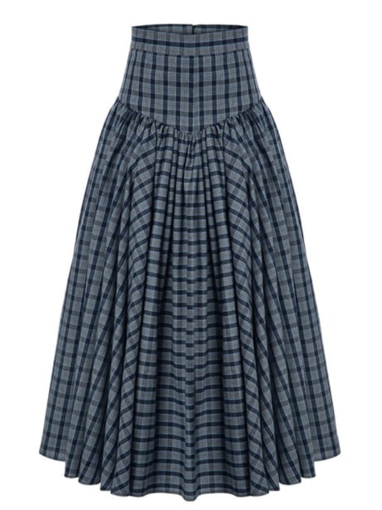 A vintage-inspired navy plaid skirt with a flattering high waist and full A-line silhouette. The classic check pattern and voluminous skirt create a polished, timeless look, perfect for both office wear and retro-chic styling.