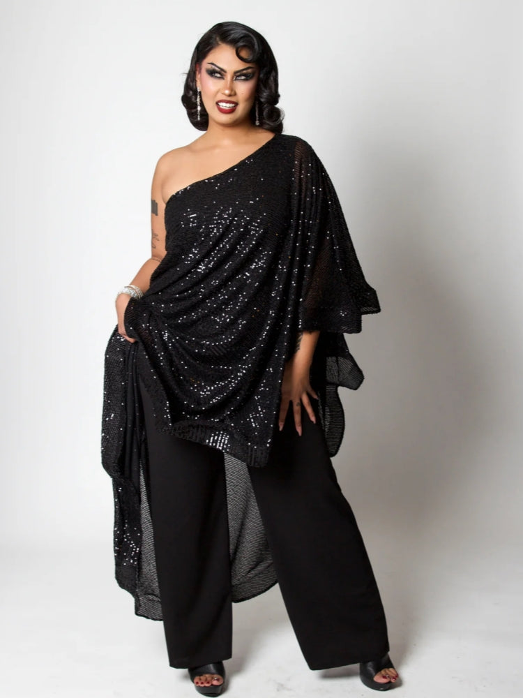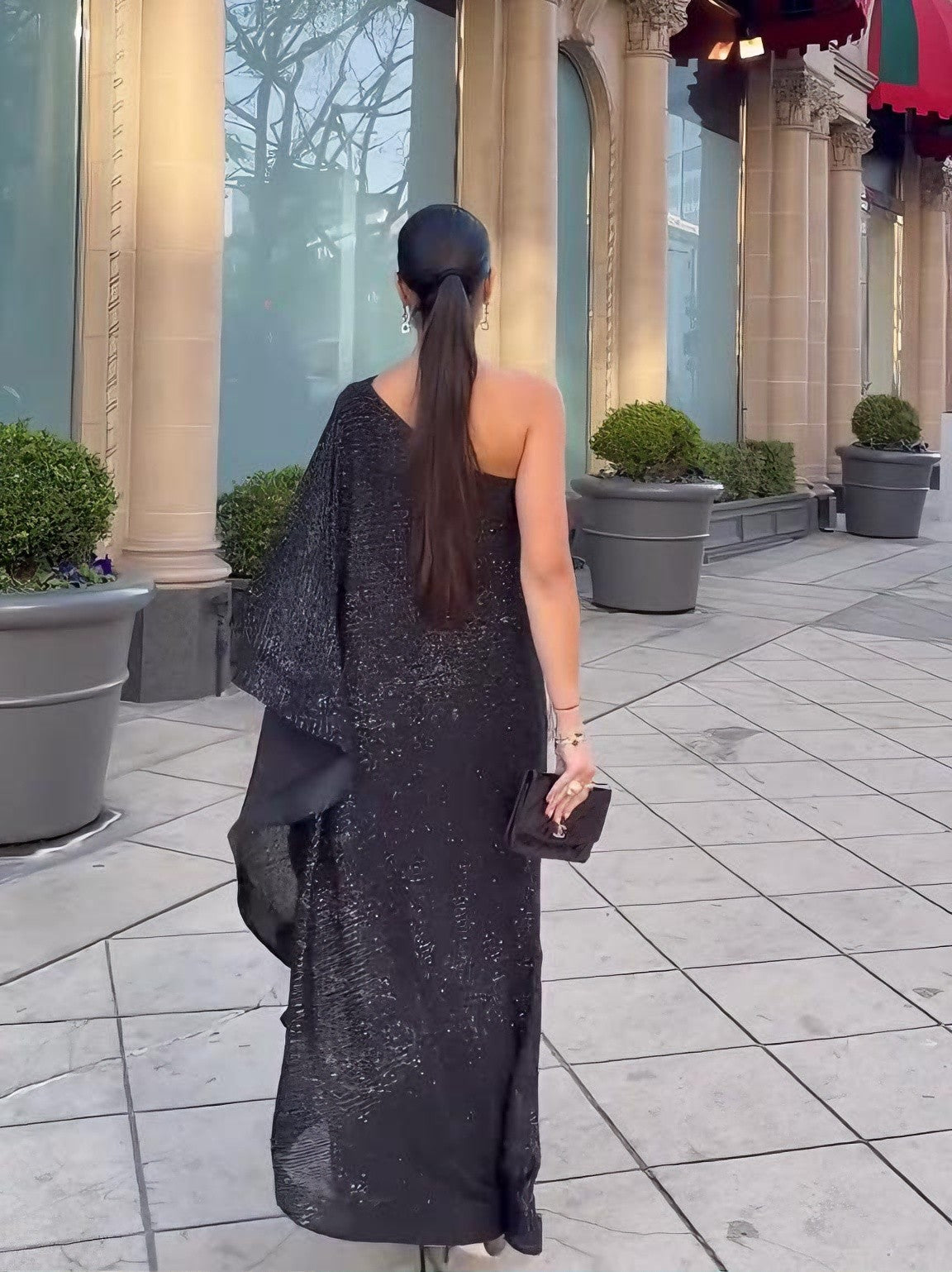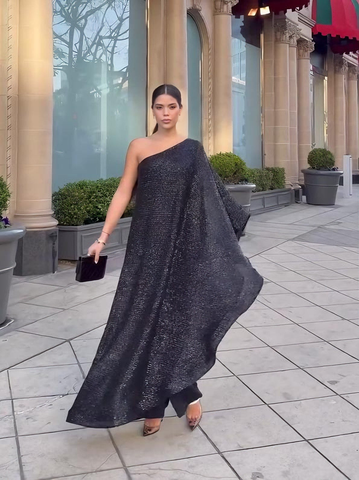 A show-stopping fusion of glamour and movement, this sequin caftan jumpsuit creates an unforgettable, elegant silhouette. Designed with a single-shoulder neckline, it features a flowing caftan overlay that adds dramatic flair and timeless sophistication. Subtle ruffle accents introduce a playful touch, while the hidden jumpsuit lining combines the ease of pants with the opulence of eveningwear. Crafted from shimmering sequined fabric, it catches the light with every step, maximizing visual impact. Wide-leg trousers ensure a flattering, fluid fit, and a breathable lining keeps comfort effortless.